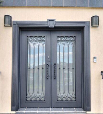 باب حديد مشغول مبروم 16 مع خلفية زجاج رش رمل